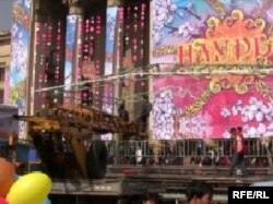 Сотрудник полиции с мегафоном на площади Астана во время народных гуляний. Алматы, 22 марта 2010 года.