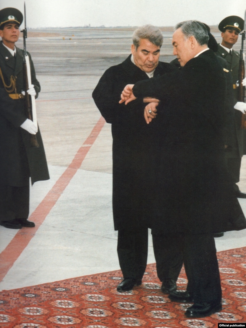 «Что касается моей персоны... я вспомнил случай. Поехали мы в Ашгабат, покойный Ниязов тогда нас пригласил. Стоим на площади - перед нами памятник высокий, наверху золотая статуя с поднятой рукой. Президент Таджикистана говорит мне: «Смотри, Нурсултан Абишевич, Ниязов Ленина поставил». Я ему: «Какой Ленин? Смотри, кто это такой». Он мне: «А кто это?» Я говорю: «Сапармурат». В это время подошел сам Ниязов и говорит нам: «Что издеваетесь?» И мне говорит: «Ты сделал больше для Казахстана, чем я для Туркмении. Ты построил государство, столицу. Почему тебе памятников не ставят?» - вспомнил Нурсултан Назарбаев.