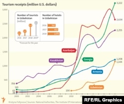 Несмотря на то, что доходы от туризма увеличились в прошлом году почти вдвое и составили около 1,2 миллиарда долларов, они всё же ниже, чем в соседнем Казахстане, а также в трех странах Южного Кавказа – Армении, Азербайджане и Грузии.
